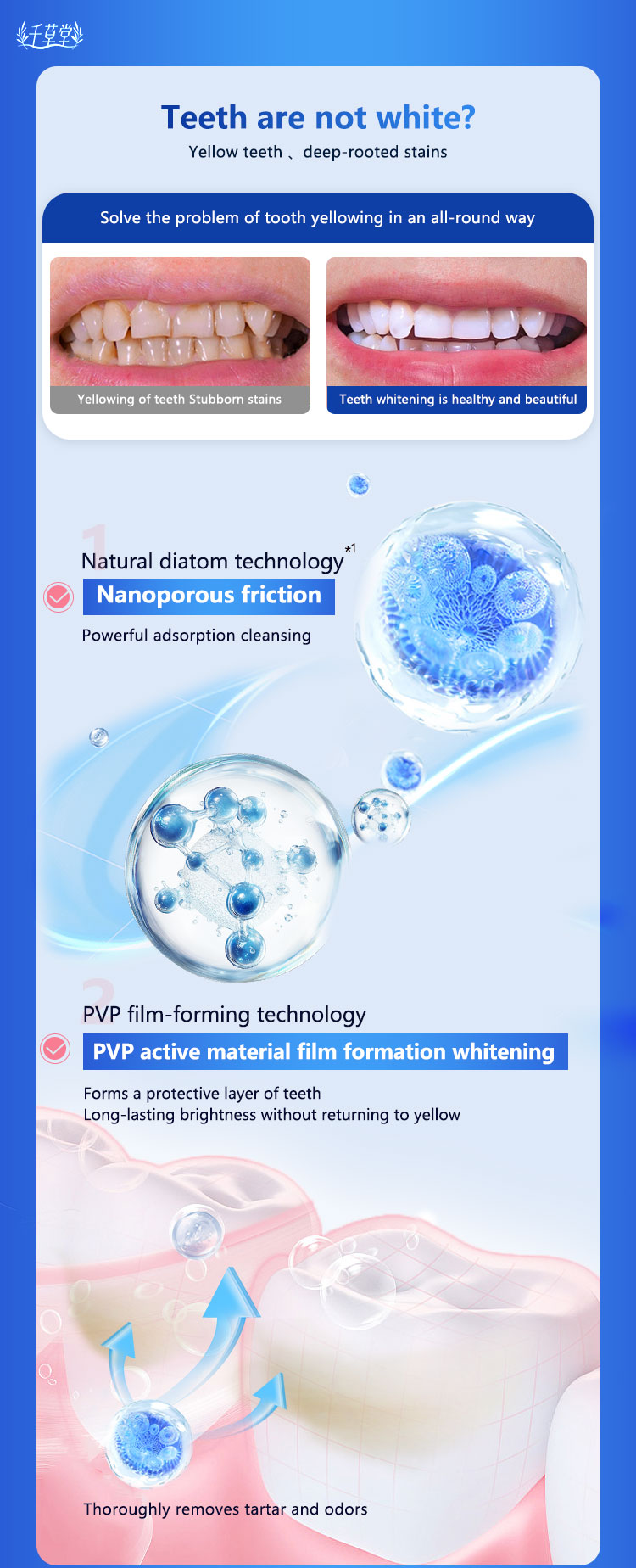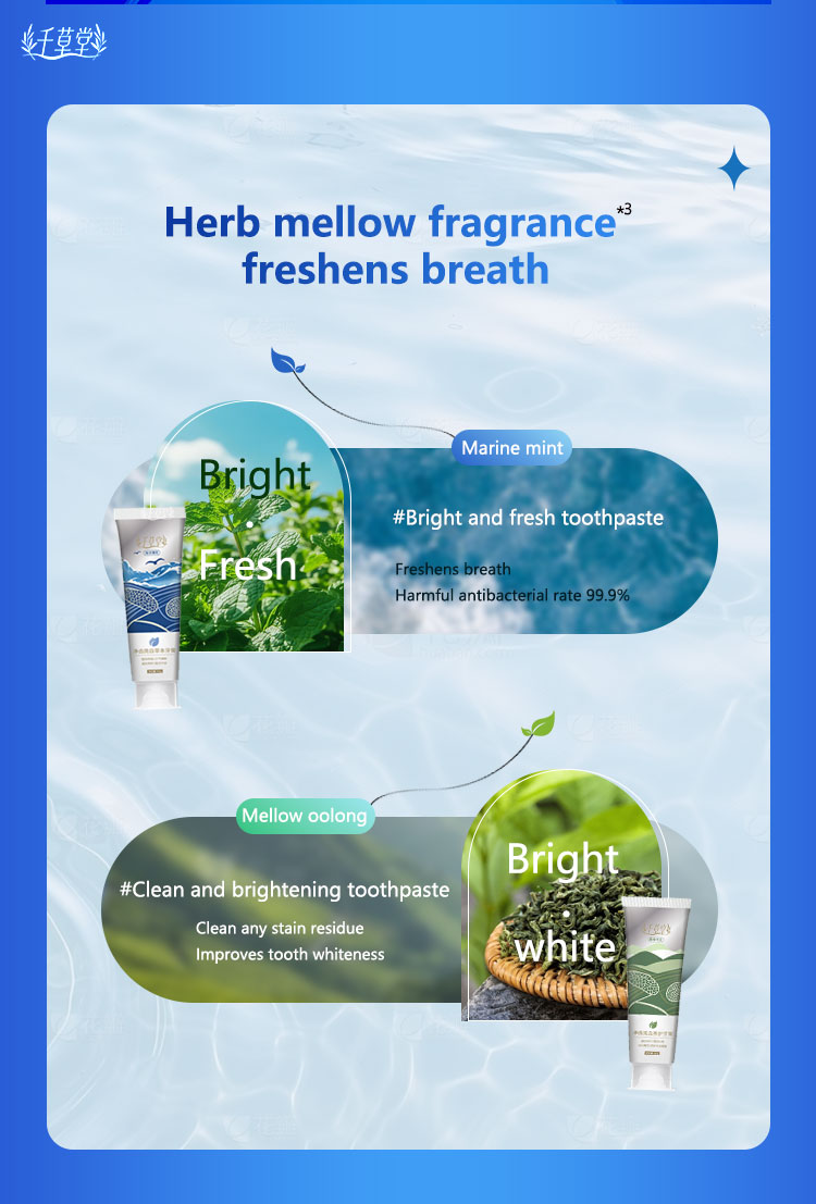 Qiancaotang Tooth Whitening Herbal Toothpaste has a patented formula, with whitening, anti-allergic, sterilization, fresh breath multiple effects, the combination of natural diatom nano materials and PVP active materials, to create a double whitening effect of teeth and whitening protective film, and add anti-allergic, sterilization and herbal ingredients to create a fresh oral environment, this toothpaste is the main mild formula, no irritation, no residue, a tube of toothpaste, multiple effects, environmental protection and peace of mind!